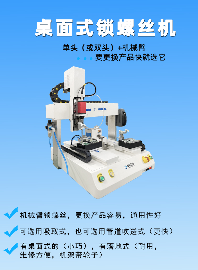 桌面型自動鎖螺絲機,主打是小規模半自動生產線。具有小型輕巧,可雙Y軸同步交替作業,提升生產效率;螺絲通用性好,通過更換螺絲送釘機或螺絲盒可實現通用M1.0~M4的螺絲,適合